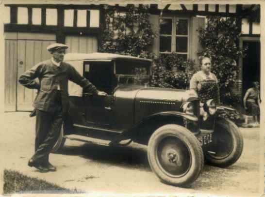 ![]() Vers 1920 : Ernest et Flora Saquet avec la BB peugeot devant la porte de la boissellerie où travaillait Ernest comme contremaître. C'est le père de Flora qui avait colorié la photo à l'époque avec un produit spécial. Source F.Postaire |