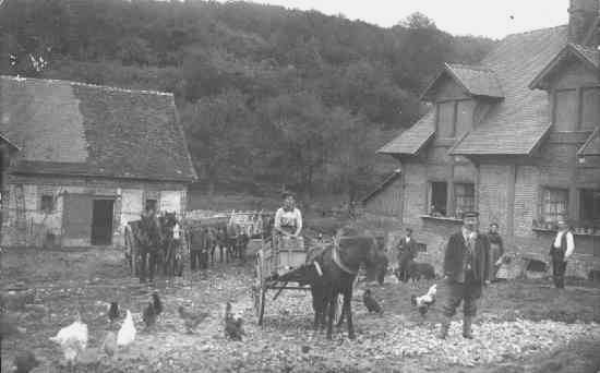 ![]() La famille Rouland à la ferme du Roule vers 1925 Une dizaine de chevaux, la famille complétait ses revenus par des travaux de fardier. Le bâtiment au fond est maintenant rasé. Assise sur la voiture :Madeleine Rouland Près de son cheval : Ferdinand Maurice, ardoisier. A droite contre la maison : Charles Rouland père et son épouse Juliette. |