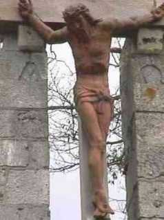 sur les pierres extérieures représentant des personnages et un calvaire. »