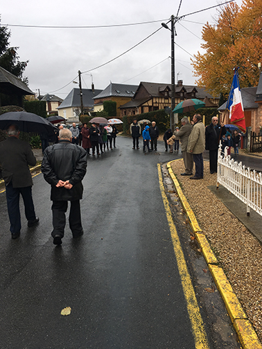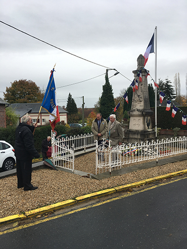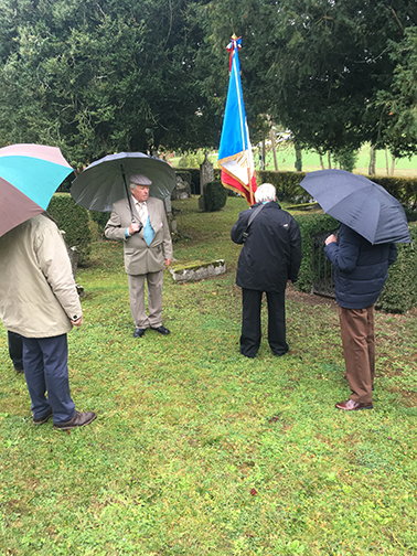 La cérémonie du centenaire de l'armistice s'est déroulée ce dimanche 11 novembre sous une pluis fine. A 11h30, recueillement devant la tombe d'un soldat inconnu de la guerre de 1870 dans le vieux cimetière. A 11h45, rassemblement devant les tombes des morts pour la France de la Grande Guerre. A 12H, dépot d'une gerbe au Monument aux Morts en présence d'une trentaine de personnes à l'invitation de la municipalité. Appel des morts pour la France et distribution des bleuets. |