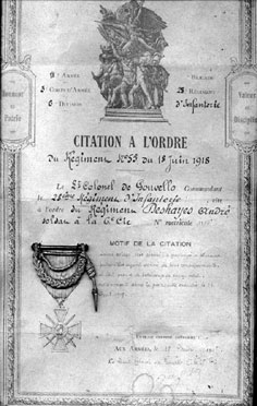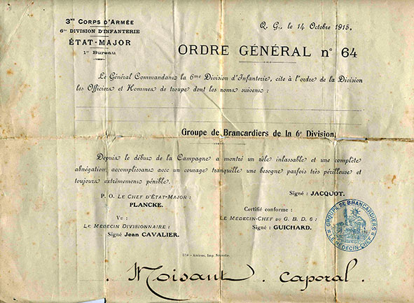 ![]() Citation à l'Ordre de la Division, le 14 octobre 1915 "Depuis le début de la Campagne a monté un zèle inlassable et une complèter abnégation accomplissant avec un courage tranquille une besogne parfois très périlleuse et toujours extrêmement pénible" |