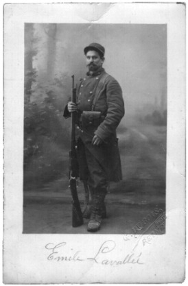 La photo d'incorporation dans la tenue de 1914 Emile LAVALLEE "Ma chère petite Victoria, regarde ton petit mari qui t'aime pour la vie." Emile est le frère d'Albert tué au front en octobre 1918 |