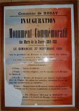 Dans son édition du 3 décembre 1921, l'Impartial relate l'émouvante inauguration du monument à Rosay. "A 14 heures, aux accents de la Marseillaise jouée par la fanfare de Charleval, monsieur Sauret, sous-préfet, venu présider la cérémonie, est reçu à l'entrée du village. D'abord un pieux pélerinage au vieux cimetière à la tombe d'un mobile mort en 1870 à l'ambulance organisée au château par Mme de Valon. Puis le cortège se forme et se dirige vers le cimetière neuf où repose un corps ramené du front, celui du fils de monsieur Demouchy: derrière la musique marchent les enfants des écoles, les familles des morts, les anciens combattants auxquels, le matin, après un service religieux avait été remis un drapeau; viennent ensuite les personnalités. Après un hommage ému à la tombe du fils de monsieur Demouchy, le cortège à travers bois, va gagner l'emplacement du Monument. Au tomber du voile, l'hymne national salue le monument, modeste et simple stèle surmontée d'une urne funéraire et ornée d'un drapeau et de la croix de guerre. M.Parravez, président de l'Association des anciens combattants de Rosay, en un discours emprunt des plus purs sentiments patriotiques, procède à la remise du monument à la municipalité. Ayant peine à maitriser son chagrin, M.Demouchy lui succède à la tribune et prononce une allocution qui amène des larmes à bien des yeux; c'est dans l'émotion générale que Mr le général Quillet donne lecture des citations des héros de Rosay." |