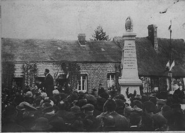 le dimanche 27 novembre 1921 En présence du sous-préfet, du général QUILLET, du député M.JOSSE, du conseiller général René de VALON et du conseiller d'arrondissement Mr MILLARD 8 heures : salves d'artillerie 9 heures : service religieux avec le concours de la Musique de Charleval 13 heures : place de la mairie, remise du drapeau aux Anciens Combattants 13 heures 30 : place de l'église, réception des autorités. Formation du cortège pour une manifestation au cimetière. 14 heures : inauguration du monument, remise du monument à la commune par les Anciens Combattants et dépôt d'une palme. Discours 16 heures : Vin d'honneur offert par la municipalité Anciens Combattants, à la société de musique et aux invités. |