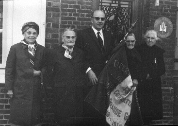 ![]() Photo souvenir le 23 octobre 1973 Les survivantes des Dames de Rosay qui avaient offert le drapeau aux anciens combattants le 27 novembre 1921. On remet ce jour un nouveau drapeau aux Anciens Combattants. De gauche à droite: Aimée Mutel, Angèle Picard, Jean Béharel le maire, Mme Tremblay, Marcelle Degisors |
