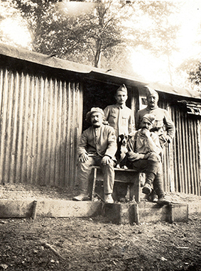 ![]() Eté 1916, secteur des Eparges Forêt d’Amblonville (Meuse) Poste de secours de l’échelon du 43e régiment d'artillerie de campagne. de g. à dr. Deschamps, Jean, Neyreneuf, le chien Négro et Dupont Maximilin assis à droite. |