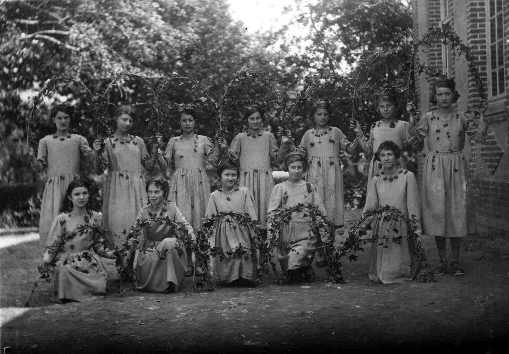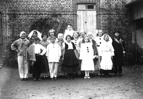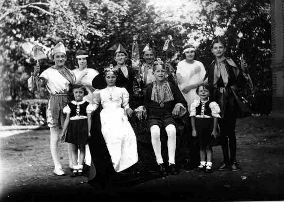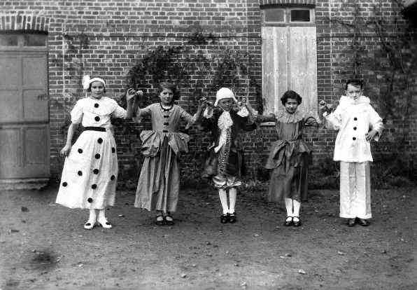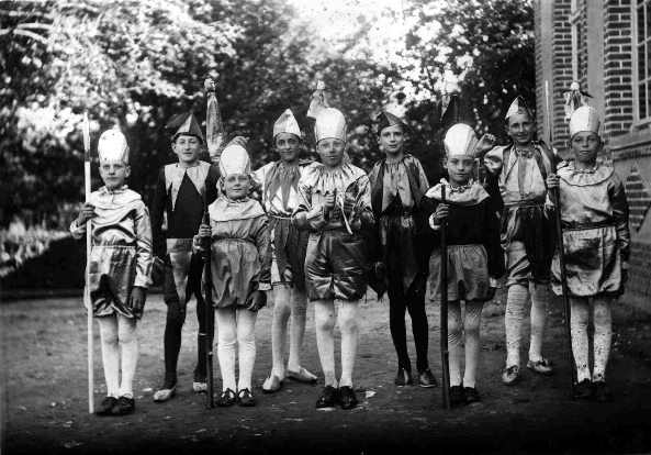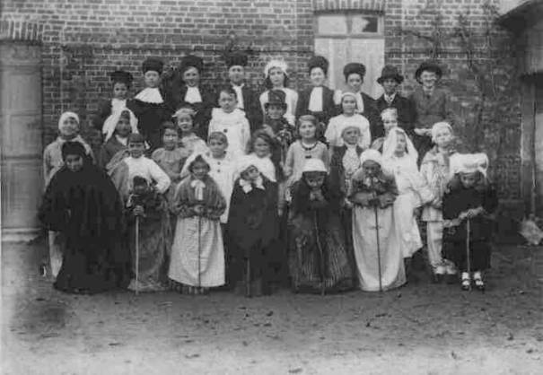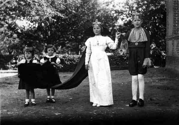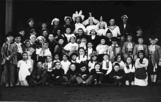 Debout troisième rang : - Sylvia Jouanne - ? - Lucienne Longet (serre-tête) - Bernard Taquet - Eugène Héquet - ?(masqué) - Micheline Noël (profil) - Fernand Lamotte (profil) - Jacques Gallard - Denise Thirel - Edmonde Dubuc- Fernand Benoist - Bernard Gambu - Micheline Soudan (reine) - Marcel Dubuc (masqué) - Michel Picard (roi) - Albert Delacour - en dessous Renée Belin et Bernadette Josse - Jacques Gildas - Raymonde Mabhit - Michel Robert - Jacqueline Desprez - Maurice Leclerc - Joseph Taquet (brun masqué) - Jacques Halleur (cheveux plaqués) - Georges Héquet - Jacques Delaruelle