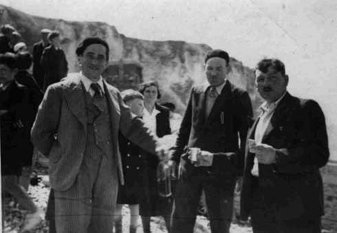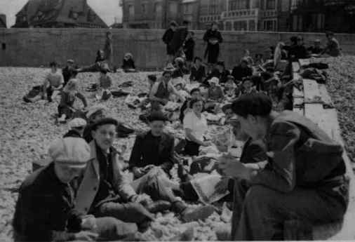 Pique-nique sur les galets. On reconnaît au second plan Mr Lecoeur qui a tombé la veste.