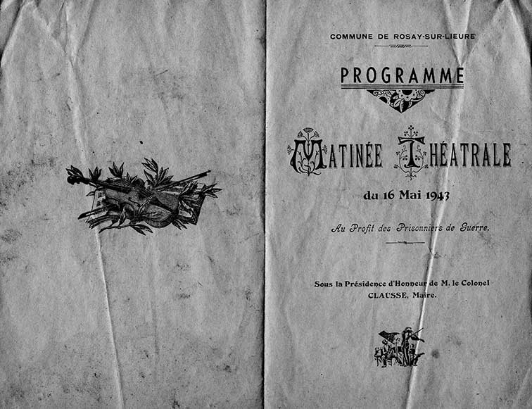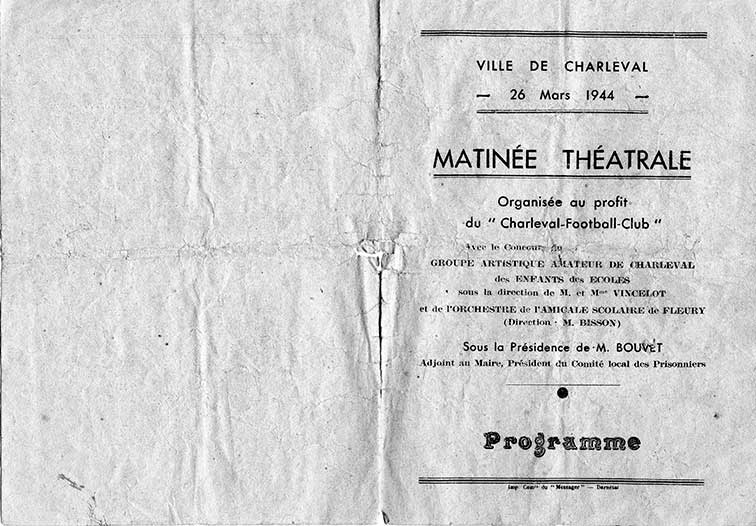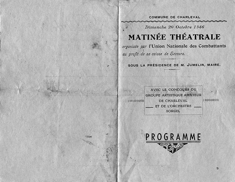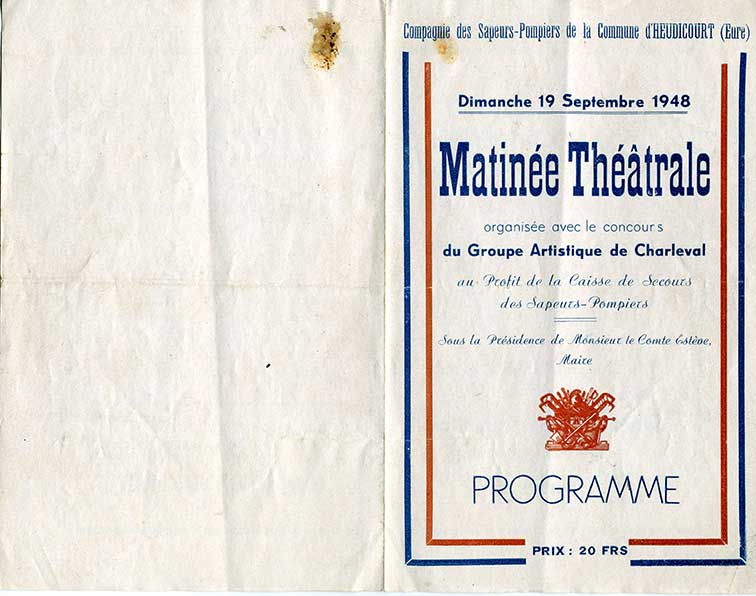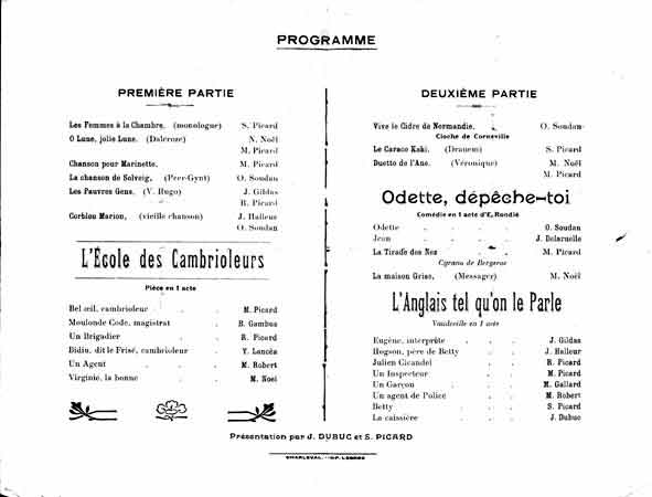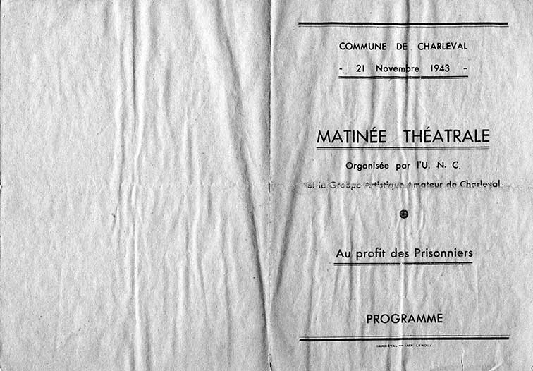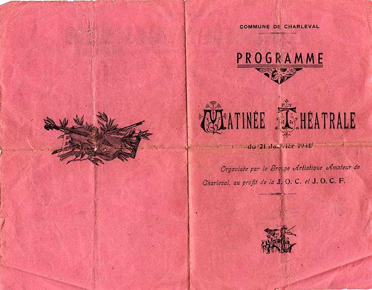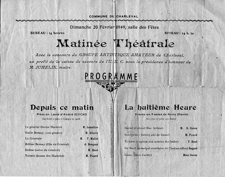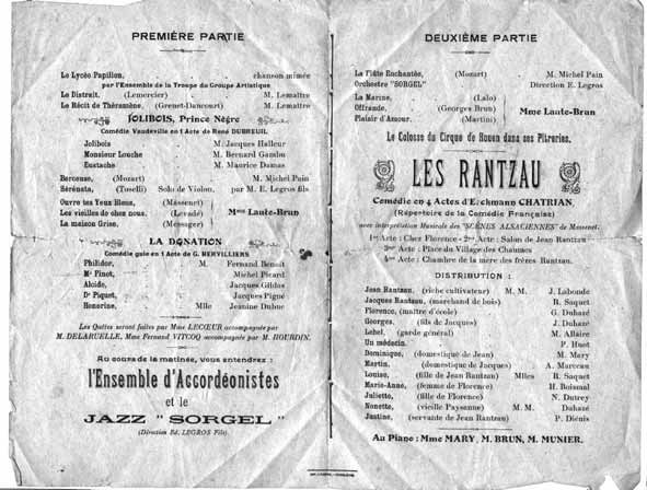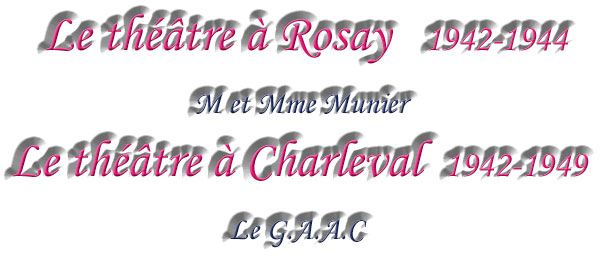 la dernière qui sera donnée à Rosay. A la fin de la guerre, on ne trouvera pas de volontaires pour prendre la relève de M et Mme Munier. L'activité théâtrale cesse. Certains membres de la troupe, tel Michel Picard, rejoindront celle de Charleval. A Rosay, les autres dimanches pouvaient accueillir des matinées récréatives d'autre nature. Ainsi: "Le dimanche 5 mars, à 14 heures, salle Duramé, Matinée Récréative au profit du livret des prisonniers de guerre avec le bienveillant concours du célèbre Fakir Ben Hassack et de la troupe du centre d'entr'aide des prisonniers rapatriés de Lyons. Au programme: séance de prestigiditation, somnambulisme et tirage des horoscopes" Journal des Andelys du 26 février 1944 A Charleval, la troupe du GAAC pousuivra ses représentations jusqu'en 1949. |