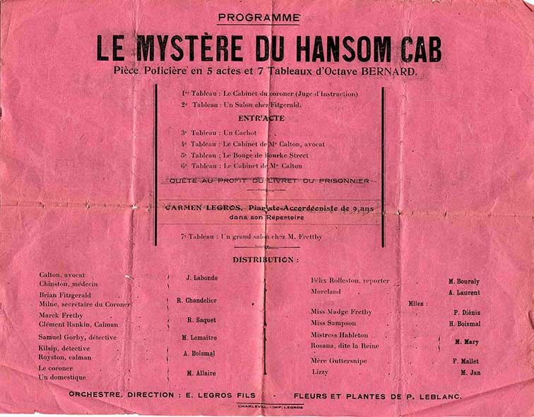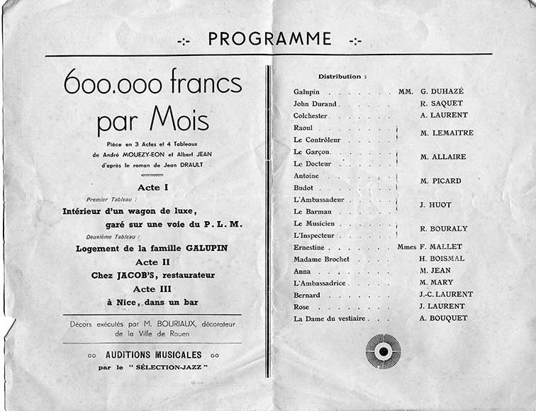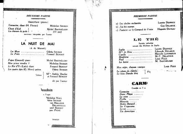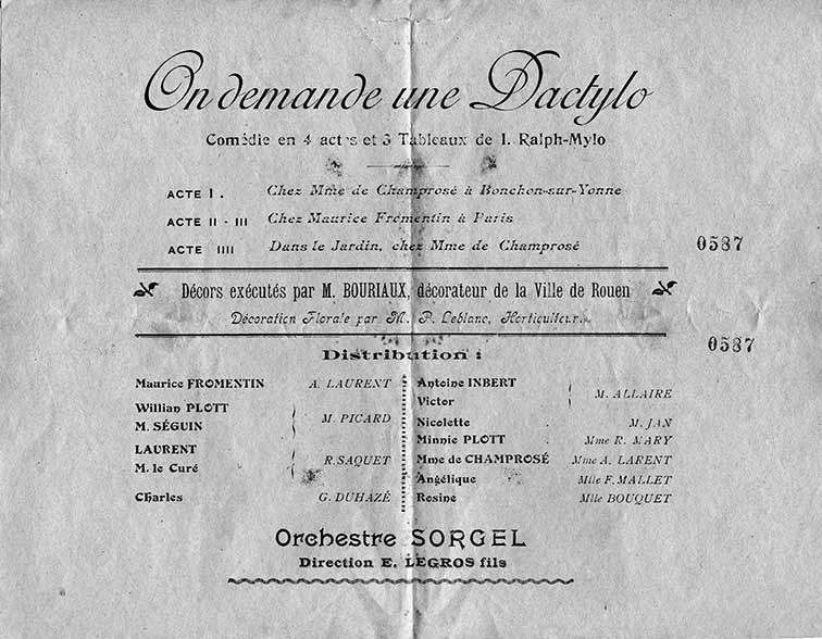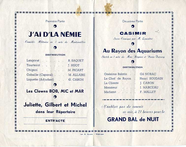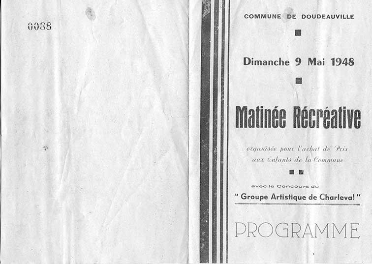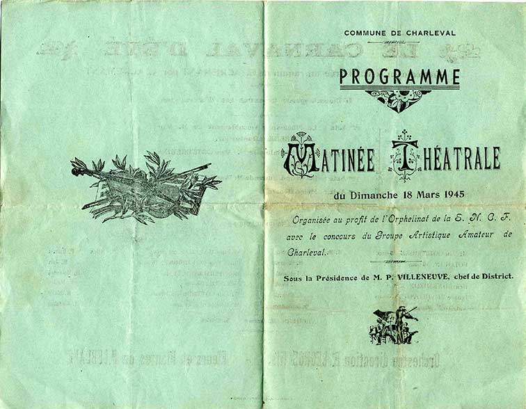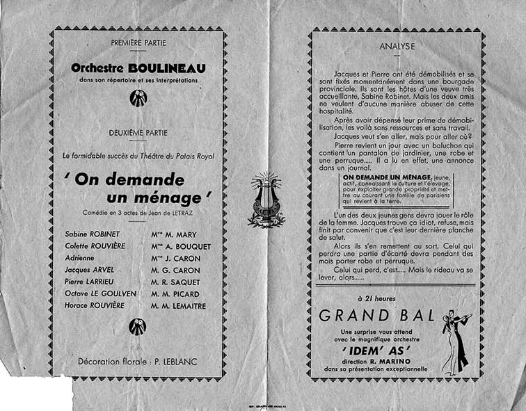la dernière qui sera donnée à Rosay. A la fin de la guerre, on ne trouvera pas de volontaires pour prendre la relève de M et Mme Munier. L'activité théâtrale cesse. Certains membres de la troupe, tel Michel Picard, rejoindront celle de Charleval. A Rosay, les autres dimanches pouvaient accueillir des matinées récréatives d'autre nature. Ainsi: "Le dimanche 5 mars, à 14 heures, salle Duramé, Matinée Récréative au profit du livret des prisonniers de guerre avec le bienveillant concours du célèbre Fakir Ben Hassack et de la troupe du centre d'entr'aide des prisonniers rapatriés de Lyons. Au programme: séance de prestigiditation, somnambulisme et tirage des horoscopes" Journal des Andelys du 26 février 1944 A Charleval, la troupe du GAAC pousuivra ses représentations jusqu'en 1949. |