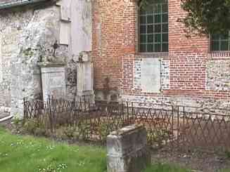 tombales de la famille de Frémont Marie Anne Thérèse de Beaupuy est l'épouse d'Antoine de Frémont. En secondes noces, elle épouse Henri Jean de Chandler, officier supérieur de la garde royale. Par Ordonnance Royale, elle obtient contre la somme de 300 Frs à verser à la commune, la jouissance perpétuelle de17 m² de terrain dans le cimetière pour la sépulture du Marquis de Rosay. Personne généreuse, elles s'engage aussi à verser aux pauvres de Rosay une rente annuelle de 50 Francs. Il y a quelques années, la tombe menaçant de s'effondrer, la commune a fait installer ces grilles pour protéger le caveau. Adolphe Joanne, dans sa Géographie de l'Eure de 1890, note sur Rosay: "Dans le cimetière, tombeau en marbre blanc, d'une marquise de Rosay morte en 1778". Il s'agit de Charlotte Renée Félicité de Frémont d'Auneuil, qui avait épousé son oncle Christophe Louis de Frémont, décédée en 1778 à l'âge de 42 ans. La belle marquise est désignée dans le pays sous le nom de "Dame qui revient". |
