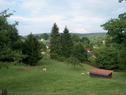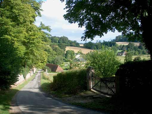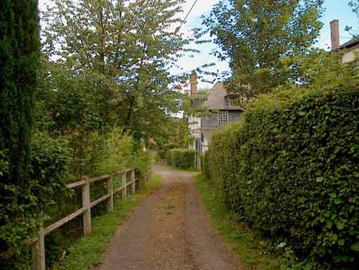 ![]() Chemin étroit, bordé par une haie de charmille. Typique des chemins du village. |