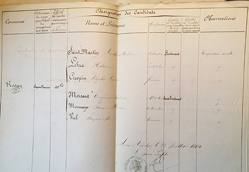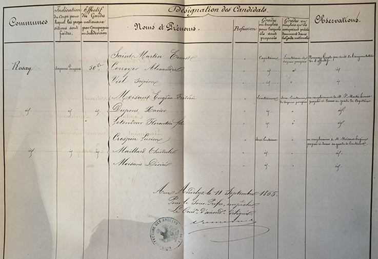 1865 : Le comte Léon de Valon, conseiller général, est élu à son premier mandat de maire. Moisant Eugène est élu adjoint. 11 septembre 1865 : courrier au sous-préfet et candidatures pour les nouveaux grades demandés par suite d’augmentation de l’effectif (50hommes). En effet, au-delà de 50hommes, une subdivision devient compagnie encadrée par un capitaine. Et on se bouscule pour les postes ! Capitaine : Saint Martin Ernest, Corroyer Alexandre, Viel Scipion Lieutenant : Moisant Eugène, Dupont Xavier, Letondeur Florentin fils Sous-lieutenant : Crespin Lucien, Maillard Théodule, Moisant Désiré |