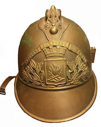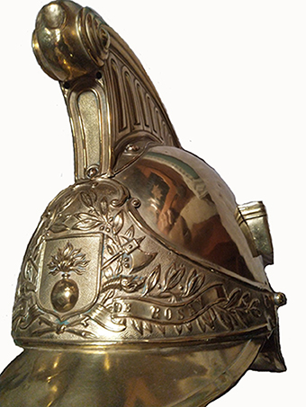 ![]() Casque modèle 1885 « sapeurs pompiers de Rosay » A droite, on remarque l'encoche pour placer le plumet rouge lors des parades |