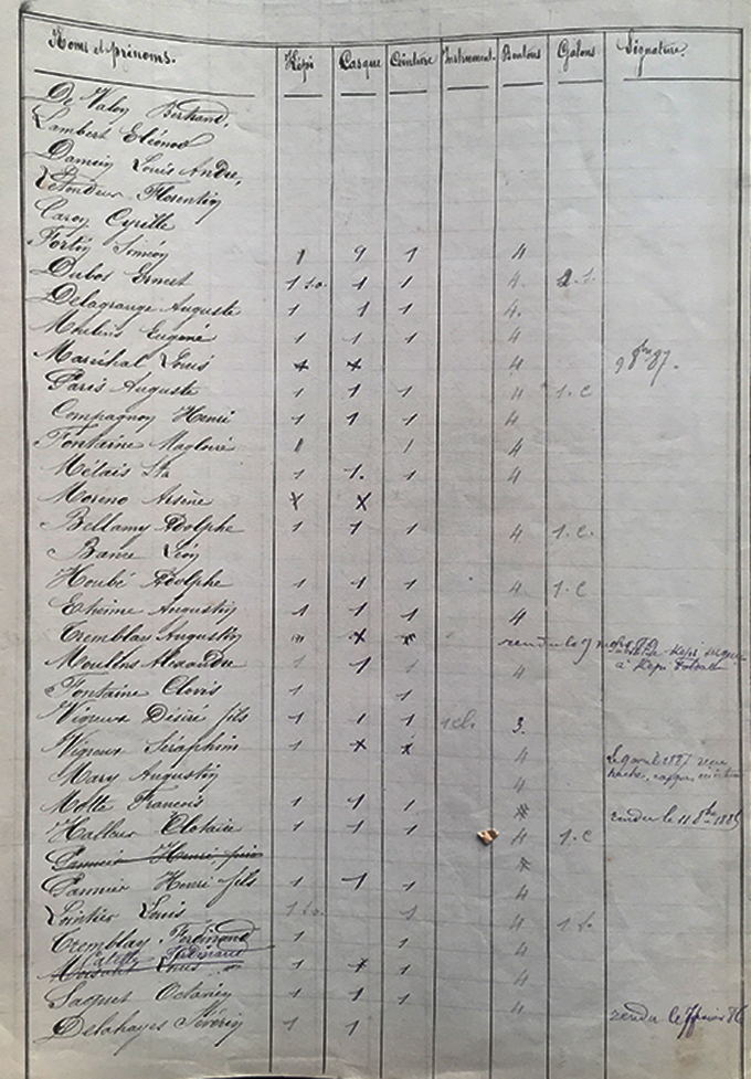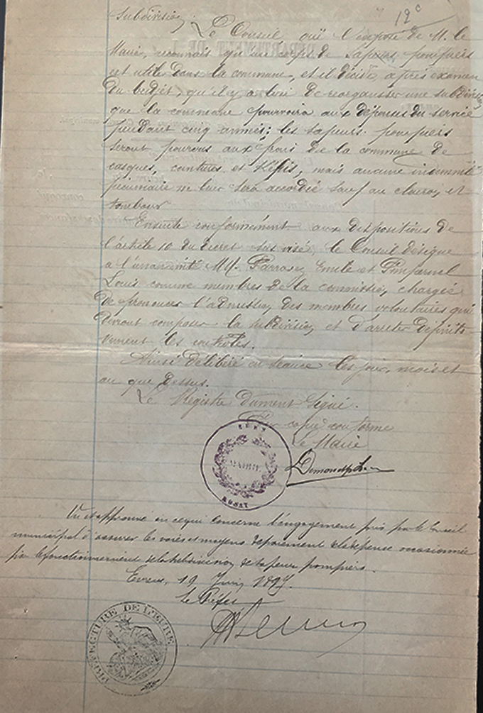 23 février 1885 : inventaire des objets d’usage de pompiers et de musique par l’adjoint au maire et l’instituteur M Campigny Ceintures de sapeurs 30 et d’officiers 2 ; Casques 43 ; képis sapeurs 38 ; officiers 2 ; sous officiers 6 Instruments de musique : 3 clairons, 3 caisses, 1 tarole, 1 grosse caisse et ses accessoires, 6 instruments de cuivre (basse, bugle,..) |