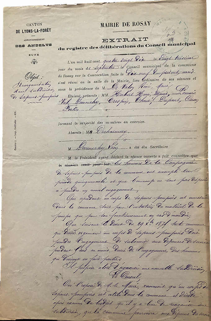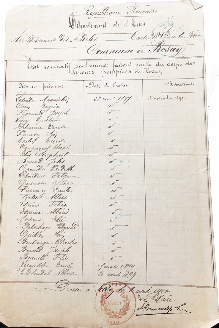 14 juillet 1905 : fête nationale La retraite partira de la mairie puis l’école, remontera la grande rue jusqu’au Bout du Haut puis reviendra par le chemin du Fol Accard. Il sera acheté pour 6F de mirlitons. 1907 : annuaire du département de l'Eure: Parravez lieutenant - 31hommes une pompe La fin de la subdision des sapeurs-pompiers de Rosay |