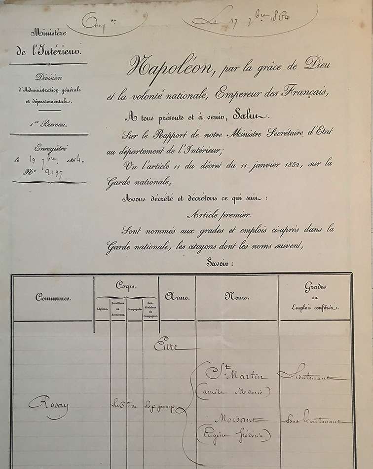 17 septembre 1864 : Napoléon III nomme au grade de lieutenant Saint-Martin Médéric et à celui de sous-lieutenant Moisant Eugène Frédéric |