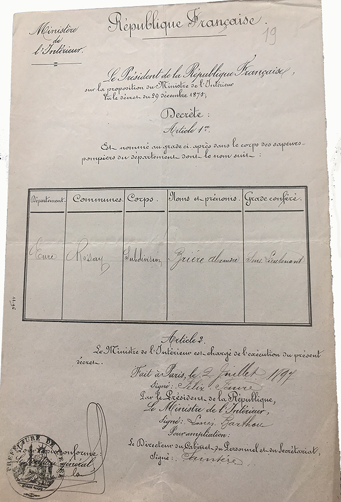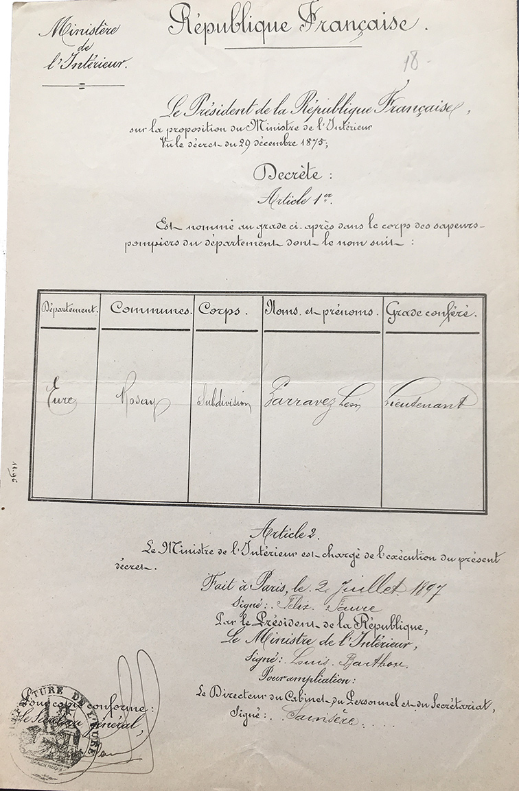 2 juillet 1897: Nomination de Léon Parravez, lieutenant et Brière Alexandre, sous-lieutenant nommés par le président de la République (Félix Faure) sur proposition du ministre de l’intérieur. |