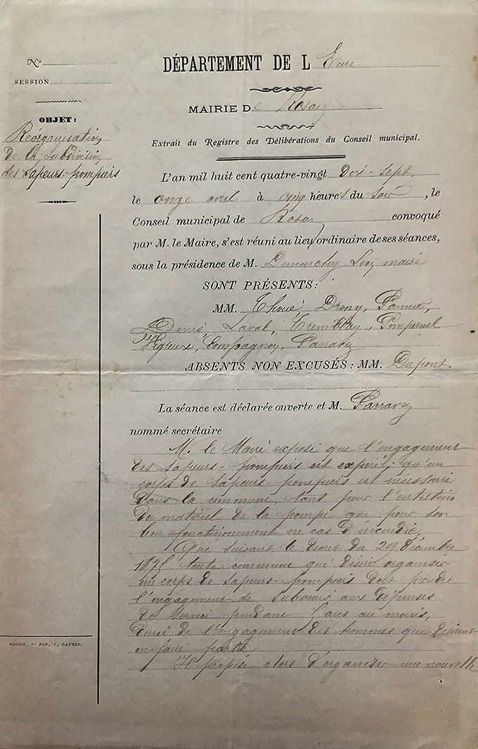 | Les corps municipaux sont entretenus et soldés par les communes de manières aléatoires suivant la richesse ou non de la commune: indemnités, exonérations de taxes ou exemption de tâches. A Rosay, à la fin de chaque période d’engagement se répète le peu de volontaires prêts à se réengager mais on réussit toujours à renouveler la subdivision malgré un règlement de plus en plus contraignant : ajout de l’article11 en 1870 «Nettoyage de la pompe. Tout sapeur-pompier qui n’aura pas acquitté le service au moment qu’il en aura eu l’ordre sera passible d’une amende de 1F». En 1878, on durcit encore : « Tout sapeur s’engage à faire partie pour 5 années consécutives. Celui qui quittera la compagnie avant que ses cinq années soient expirées sera tenu et s’engage à payer au caissier de la compagnie, savoir : sapeurs et caporaux : 5F sous-officiers :7,50F officiers :10F ». En 1899, M.Milliard Ernest propriétaire de la ferme la Campagne donne une somme de 100F portée au budget des pompiers mais à répartir entre les sapeurs pompiers, soit un peu moins de 2,50Fpour chacun des 42 hommes ! Pour mémoire, l’amende pour s’être présenté à un incendie sans son casque est de 2F. En 1903, le conseil considérant qu’il y a lieu d’entretenir la pompe à incendie en parfait état décide que cet entretien aura lieu 3 fois par an, les 15 mars, 15 juin et 15 octobre. La personne qui s’engage devra fournir huile, graisse et tout le nécessaire, devra avertir le maire si une réparation se fait sentir. La pompe devra être mouillée chaque fois. Lors de la réorganisation de 1890, Thoué et Caron Cyrille sont membres de la commission chargée de prononcer l’admission des volontaires qui devront composer la subdivision. La décision de composition appartient toujours au maire mais sous approbation du préfet. Le préfet approuve le 28 novembre 1890. | |