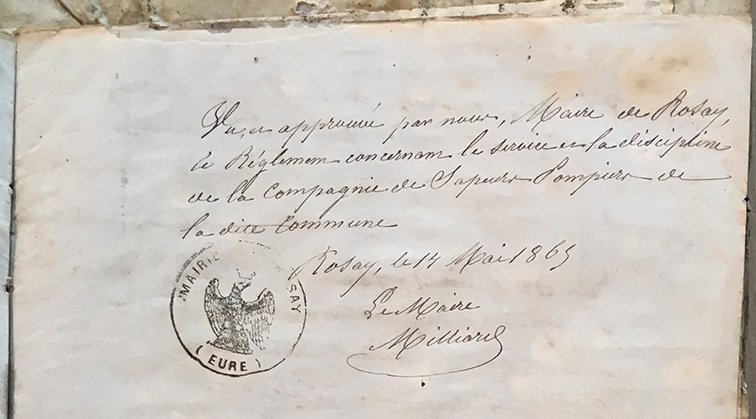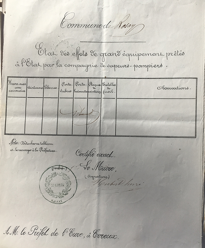 | Lors de la guerre de 1870, l'état réquisitionne les équipements de pompiers. En 1872, le maire de Villez sous Bailleul (entre Gaillon et Vernon) reconnit avoir reçu un équipement de la préfecture. Ce récipissé est une indication sur l'équipement d'un pompier à cette époque, en particulier sur le fait qu'il puisse être armé. A Rosay, le maire renvoi en préfecture un courrier indiquant l'absence d'équipement prêté. On sait que lors de l'invasion prussienne en 1870, le matériel de musique avait été mis en sécurité au château. On pet penser qu'il en a été de même pour l'équipement des pompiers. |