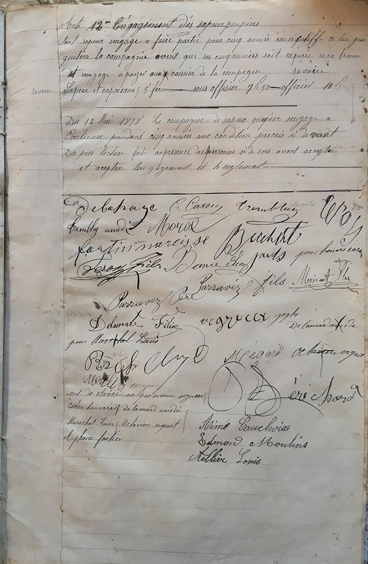 12 mai 1878 : ajout de l’article12 au règlement et signature des sapeurs volontaires du 12 mai 1878 La compagnie de sapeurs-pompiers s’engage d’honneur à continuer pendant cinq années aux conditions prescrites ci-devant » suivent toutes signatures dont en premier Moisant lieutenant |