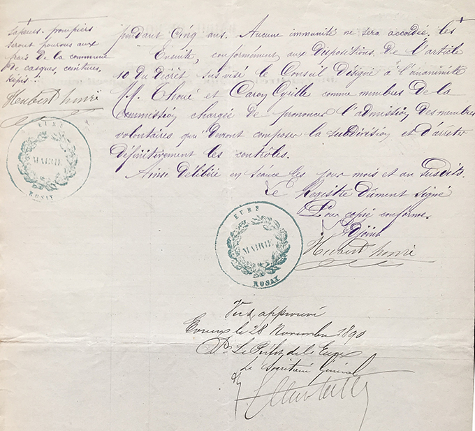 28 novembre 1890 : courrier du préfet concernant l’organisation de la compagnie Art1 : nommés membres de la commission chargée de l’admission des volontaires Crespin Lucien- Daniel Pascal- Decharencey Paul |